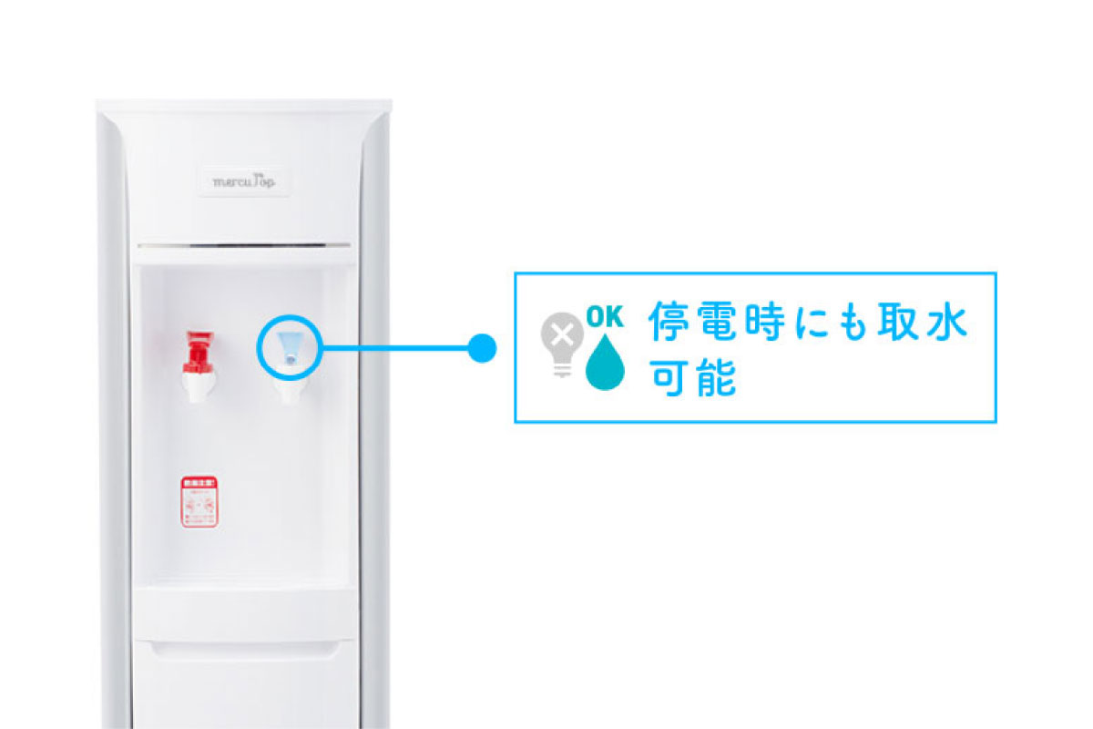 ウォーターサーバー[スリム]と、[スリム卓上]は、停電時もレバーを押すことで常温の天然水が使えます。[シタカラ]は停電時は水が出なくなりますが、別売りの非常用コックをご利用いただくことで、ボトルから直接給水が可能です。