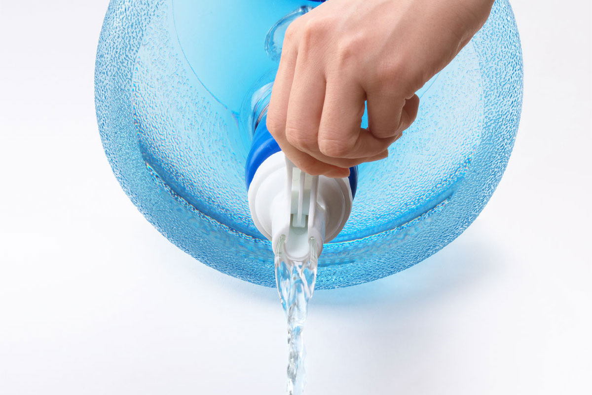 - 3.ボトルを寝かせて台などに置き、非常用コックのレバーを握り合わせるとコックが開き、天然水が出ます。