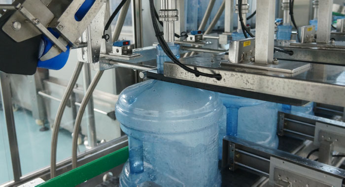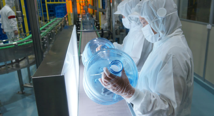 ボトルへ天然水が自動充填されます。クリーンルームで24時間、微粒子や菌数等の管理を行う無菌的空間で高度な衛生を保つために、人の立ち入りも制限されています。