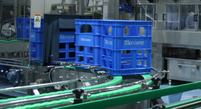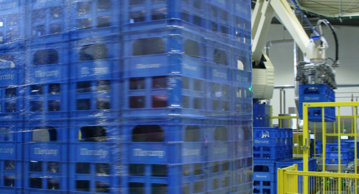 ボトルとケースをロボットで分け、ケース洗浄機でケースを自動洗浄します。落ちない汚れがないことを確認するため、ケースも人の目で検品します。